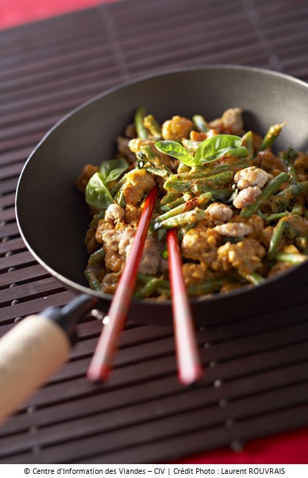 1• Chauffez le wok, ajoutez l'huile puis la viande et faites-la revenir 5 min. à feu moyen.