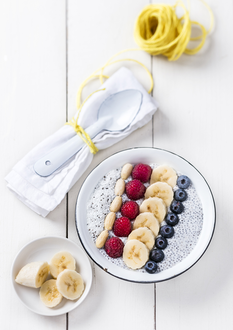 ①• La veille, verser les graines de chia dans un petit bol et ajouter le lait d’amande. Bien mélanger et réserver au frais toute la nuit (mélanger de temps en temps si possible).