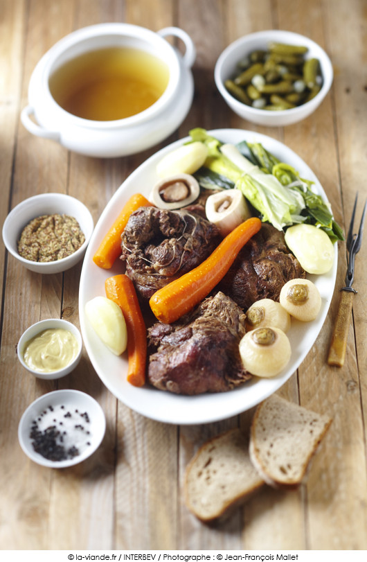 Servir les viandes du pot-au-feu et les os à moelle entourés de leurs légumes, présenter le bouillon en soupière et accompagner de tranches de pain grillées, de fleur de sel, de différentes moutardes et de cornichons.
