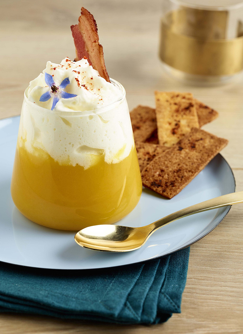 Potage en verrine, crème de Chaource AOP, chips de lard et croûton mouillette