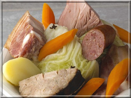 7.Ajoutez au contenu de la marmite la poitrine, le jambonneau, les saucisses, l'andouille et les pommes de terre. Poursuivez la cuisson 30 à 40 minutes.