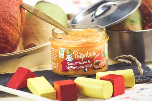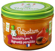 La gamme POTPOTAM comporte des recettes équilibrées et gourmandes adaptées à l’âge et à l’évolution de la dentition des bébés. Son petit pot «Cassolette aux 4 légumes grillés» est digne des grands chefs ! Il réunit le meilleur du potager : de quoi donner à Bébé l’envie de devenir jardinier ou maraîcher plus tard !