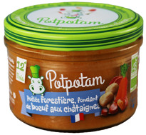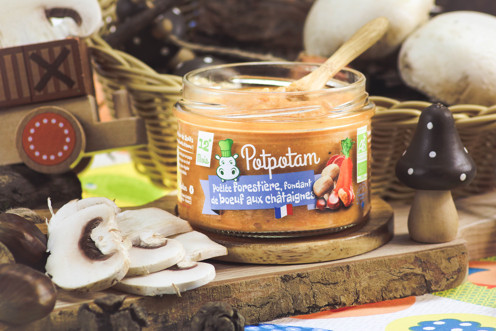 La gamme POTPOTAM comporte des recettes équilibrées et gourmandes adaptées à l’âge et à l’évolution de la dentition des bébés. Son petit pot «Poêlée forestière, fondant de bœuf aux châtaignes» est cuisinée comme au restaurant.
