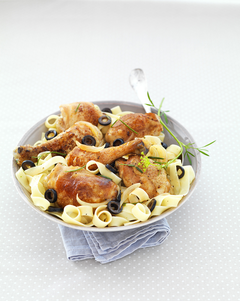 Poulet à la moutarde, aux olives noires et herbes de Provence