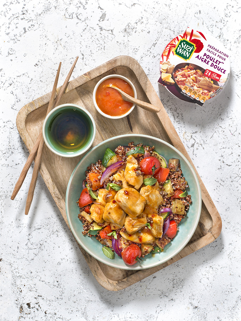 Poulet aigre douce, quinoa rouge et légumes d’été