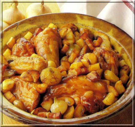 5.Au bout de 45 mn, remettre lardons, champignons et oignons dans la cocotte. Les mélanger au jus de cuisson. Laisser mijoter 10 à 15 mn. Servir avec les pommes de terre rissolées.