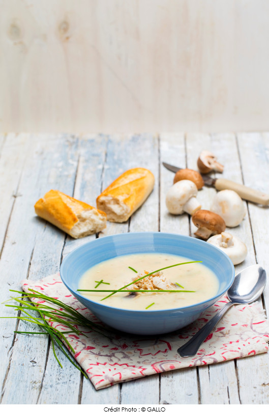 Verser la soupe crémeuse dans un plat, ajouter le poulet émincé et les champignons et décorer avec la ciboulette.