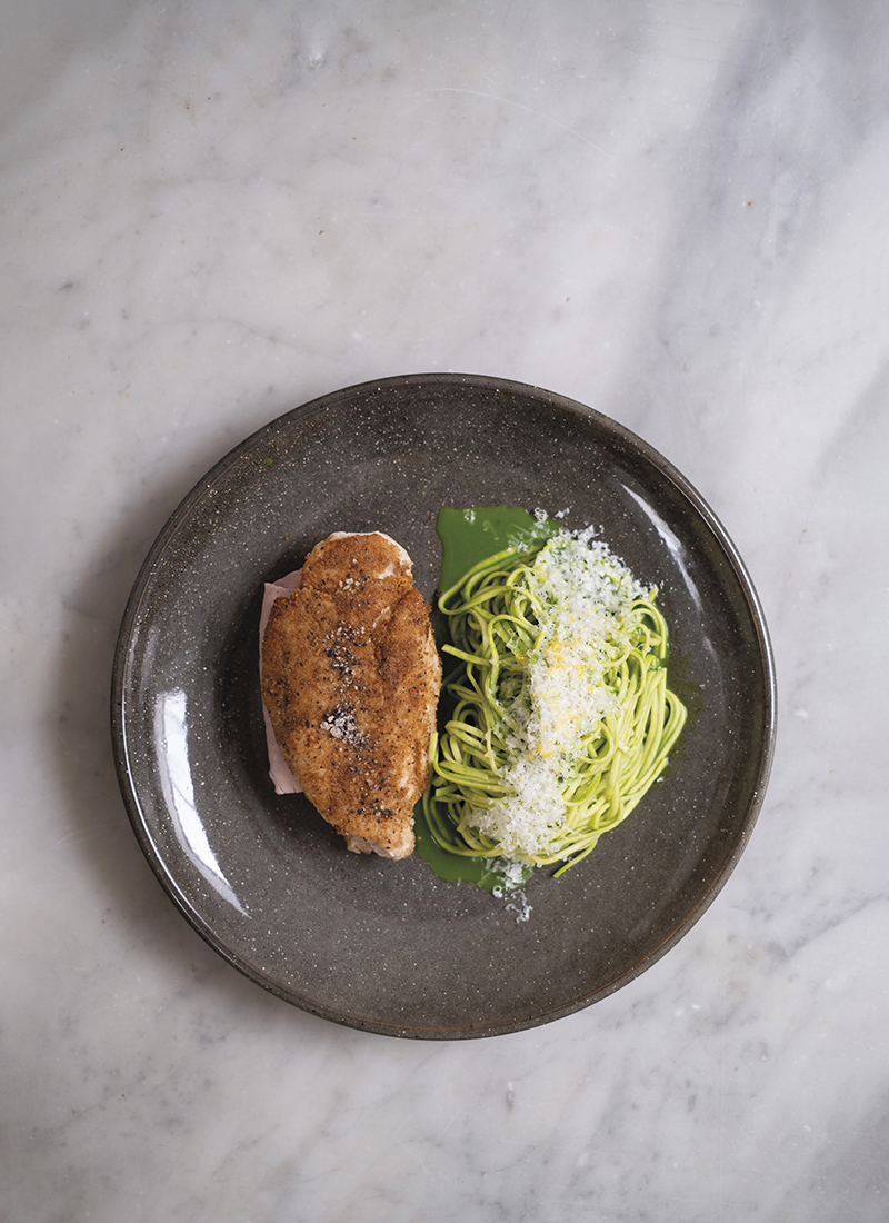 Poulet fermier Label Rouge façon cordon bleu au jambon blanc linguine au jus vert
