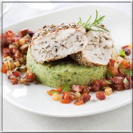 Poulet Mariné aux Herbes de Provence, Sauce Chorizo et Purée de Courgettes