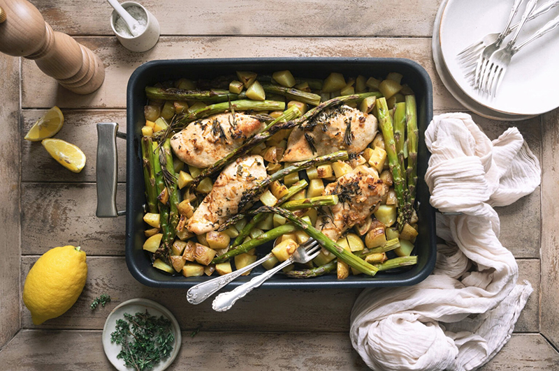 Poulet miel et citron, pommes de terre primeur rôties & asperges