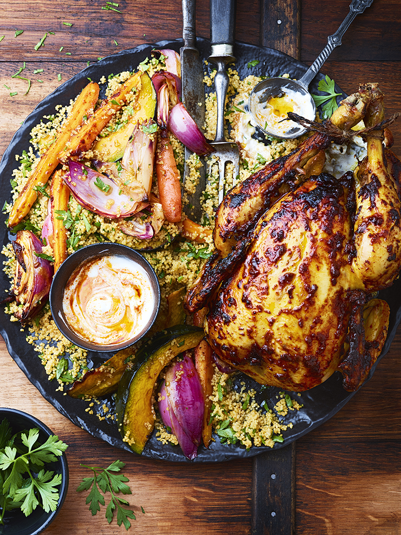 Servir la semoule avec les légumes, le poulet et le yaourt à l’harissa.