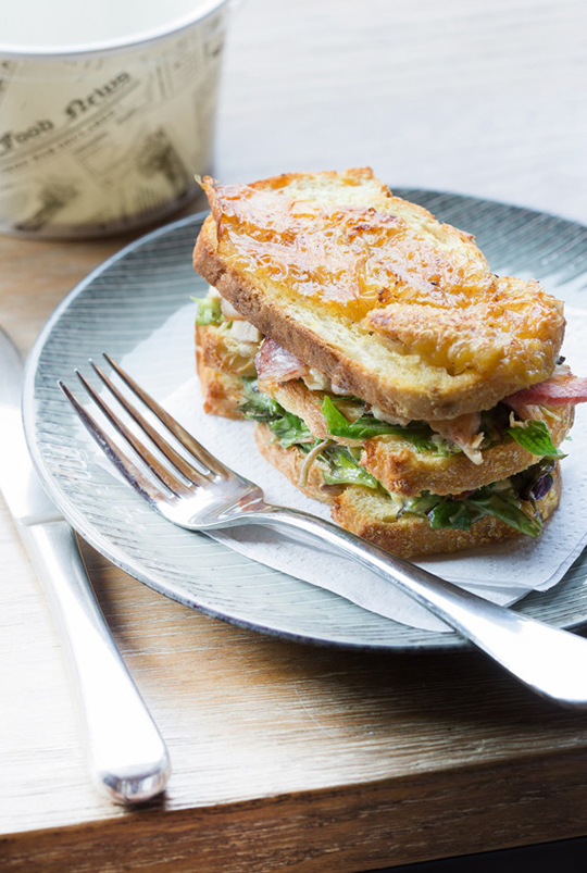 ④• Toastez les tranches de pain de maïs au grille-pain ou au four à 160°C (th. 5-6) pendant 1 min. Tartinez 1 tranche du mélange mesclun-mayonnaise, puis ajoutez le poulet et le lard. Réitérez cette opération, puis empilez sur la première tranche et surmontez le tout d’une dernière tranche de pain toasté.