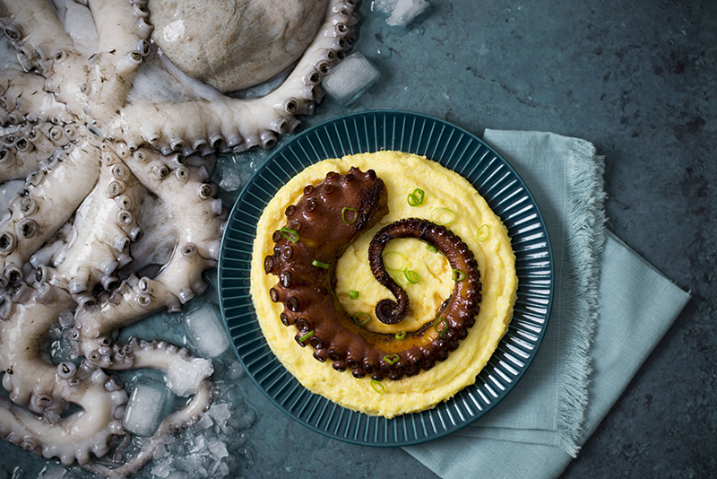⑤• Le dressage • Découpez finement les tiges de l’oignon. Dressez la polenta dans les assiettes avec le poulpe par-dessus.