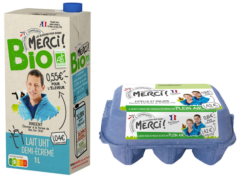 Ainsi, le lait bio MERCI ! d’Intermarché, sorti en février 2020, offre une juste rémunération aux 45 éleveurs qui se trouvent près de la Laiterie Saint-Père-en-Retz : Sur chaque brique de lait Bio MERCI ! vendue à 1,04 €, l’éleveur touche 0,55 €.
