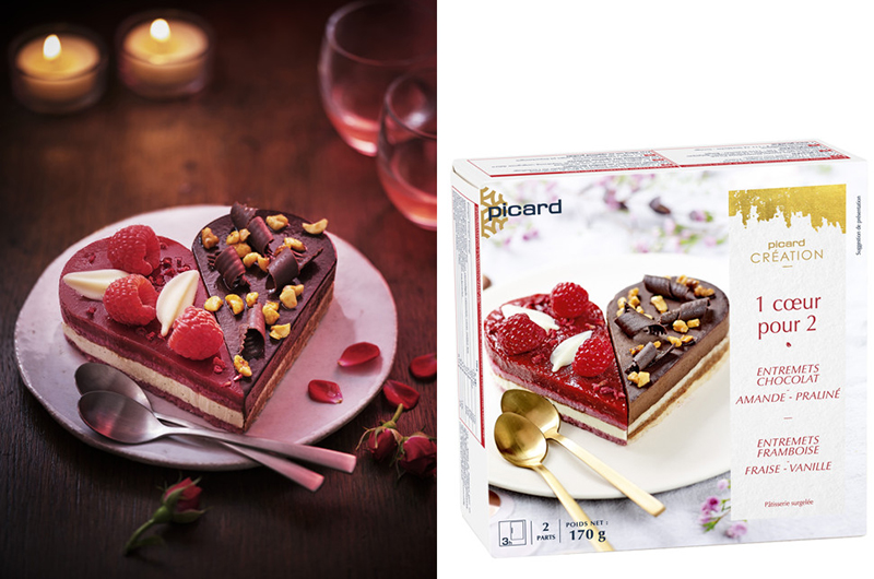 Quand on aime, on partage tout… Picard a donc imaginé un seul cœur pour deux amoureux, constitué de deux entremets. L’un marie une mousse au chocolat noir, un biscuit à l’amande et un croustillant au praliné à l’amande. Le second est une association de mousse à la vanille, biscuit à l’amande et coulis à la framboise. Une édition limitée, idéale pour conclure délicieusement une soirée de Saint-Valentin, romantique et chic.