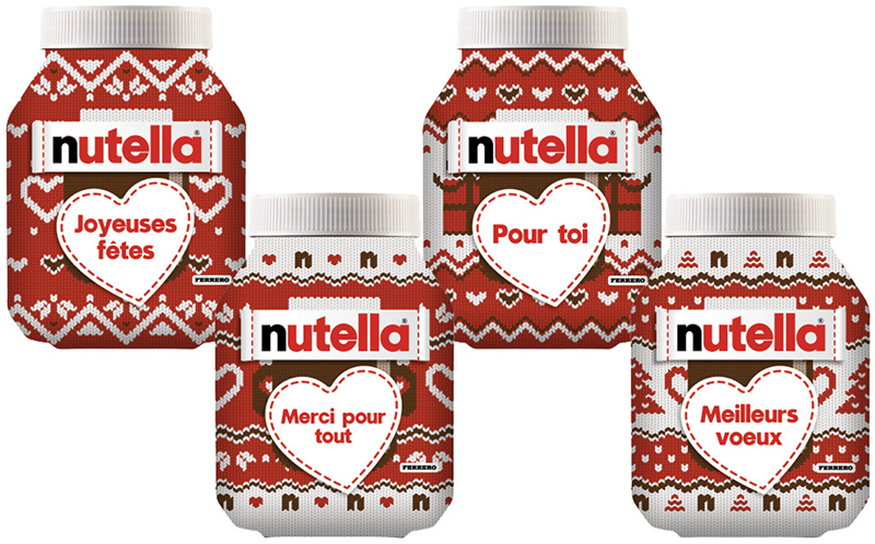 Comme chaque année, les pots de Nutella® se parent de leurs plus beaux habits de Noël pour une collection spéciale, en édition limitée. Et pour ceux qui souhaitent offrir un cadeau gourmand et personnalisé, il est possible de créer un pot unique sur Nutella.com. Pour cela rien de plus simple, on sélectionne le motif de son choix parmi les 8 designs exclusifs pour les fêtes, on rédige son message pour surprendre son destinataire et il ne reste plus qu’à imprimer l’étiquette, la coller sur le pot de Nutella® et le tour est joué.