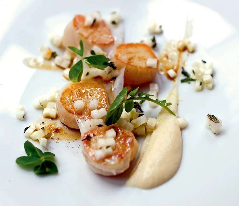 • Saint-Jacques snackées accompagnées d’une purée de céleri et brunoise de pommes