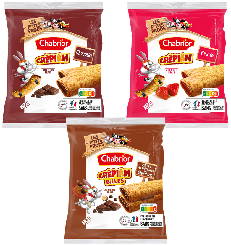 Des crêpes préparées comme à la maison et fourrées au chocolat, à la fraise ou au chocolat avec un supplément de vraies billes de céréales pour plus de gourmandise, telle est la recette des Crêpiam de Chabrior ! Grâce à leur format individuel, elles se glissent en un clin d’œil dans le cartable, et s’imposent comme le partenaire essentiel du goûter ! Intermarché en tant qu’enseigne Producteurs & Commerçants fabrique toutes ses crêpes dans l’hexagone, à partir de farine de blé française et le tout sans huile de palme et sans conservateur !