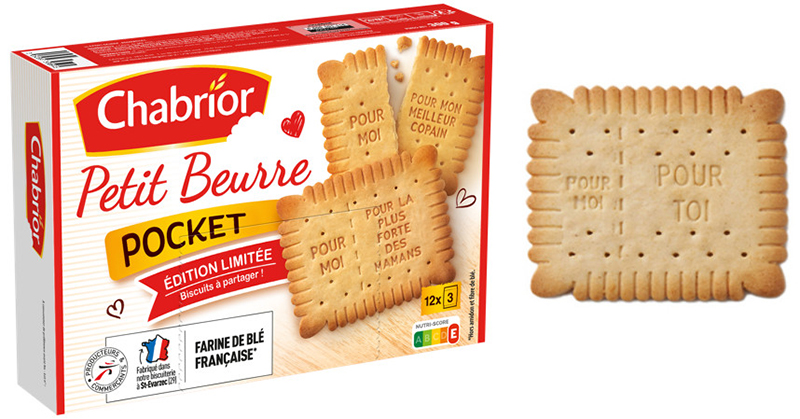 Et parce que goûter rime avec partage Intermarché créé pour la rentrée les petits beurres à messages Chabrior. Découpés en deux par des pointillés ces biscuits sont une invitation gourmande à partager des petites attentions à l’occasion du quatre heures. Les plus petits peuvent donc décider d’offrir la seconde moitié à leur amoureuse, leur meilleur copain ou leur voisin de classe. Fabriqués dans notre biscuiterie à St-Evarzec (29) à partir de farine de blé française, ces petits-beurre aux 20 messages différents ont véritablement le goût du partage !