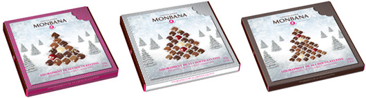 Cette année, les boîtes de chocolats fins élaborés par le Maître Chocolatier MONBANA revêtent un écrin Noël des plus élégants. Les chocolats fins aux éclats de biscuits, de noisettes ou de caramel viendront combler les amateurs de saveurs classiques, tandis que les recettes à base de ganache fondante surprendront les amateurs de saveurs nouvelles : thé vert aux fleurs de jasmin, figue, fève Tonka, pistache sont les ingrédients surprises de cette année.
