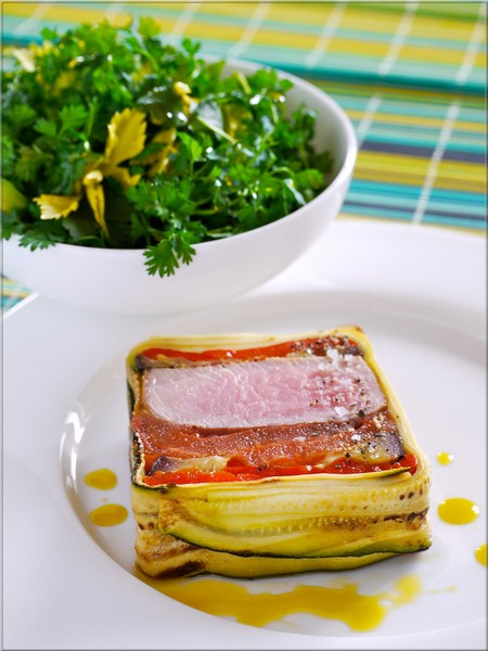 3- Chemiser un moule à cake de film transparent, étaler les bandes de courgettes puis une couche d’aubergines en tranche. Assaisonner légèrement de fleur de sel et de poivre mignonnette, déposer le filet mignon de veau (possibilité de le tailler en deux morceaux pour l’adapter aux dimensions du moule), puis recouvrir de lamelles de poivrons rouges grillés, de courgettes, d’aubergines et de tomates en alternant les couleurs. Rabattre le film transparent, placer un poids au-dessus de la terrine et réserver toute la journée au réfrigérateur.