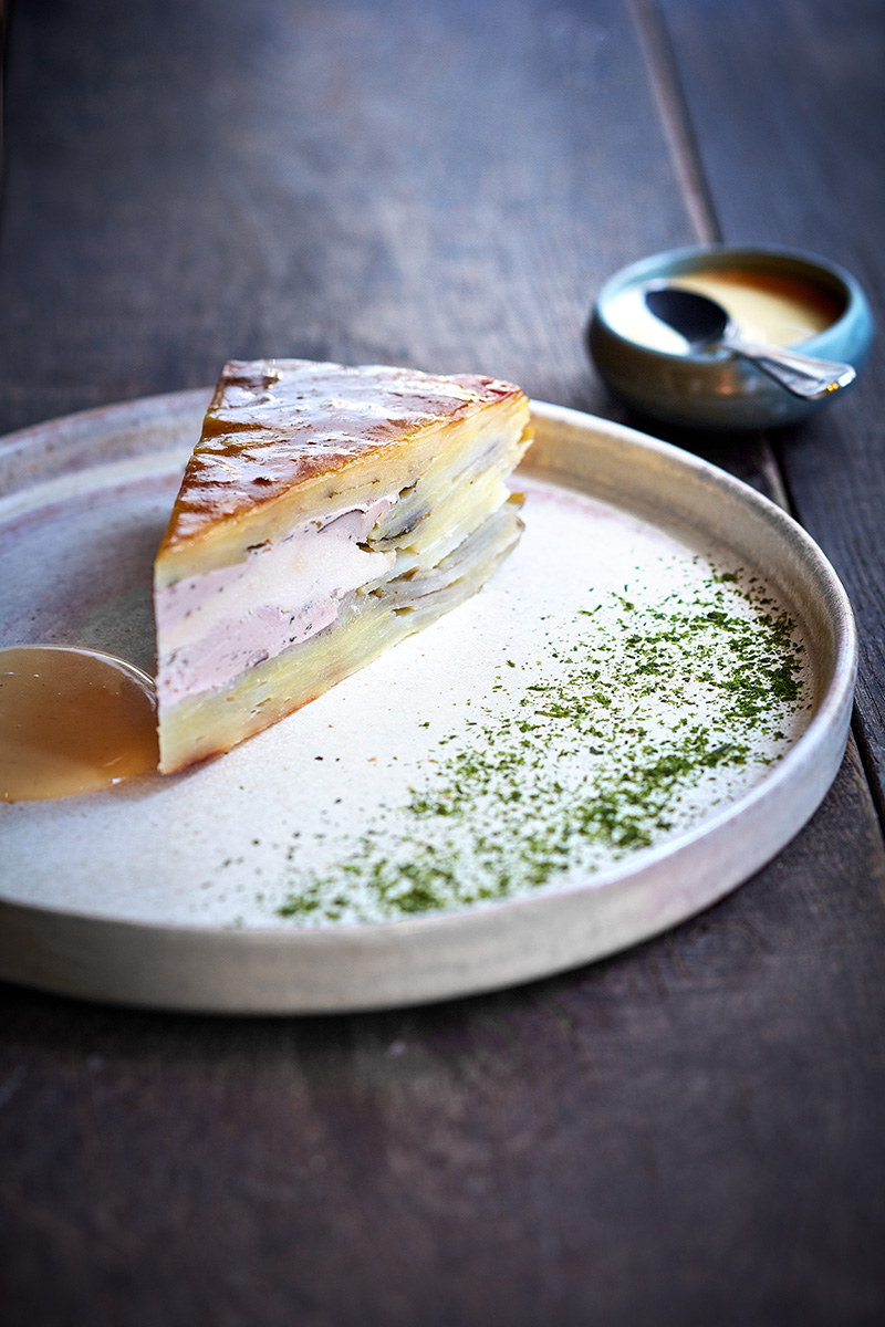 Pressé de pommes de terre aux champignons et volaille, sauce vin jaune