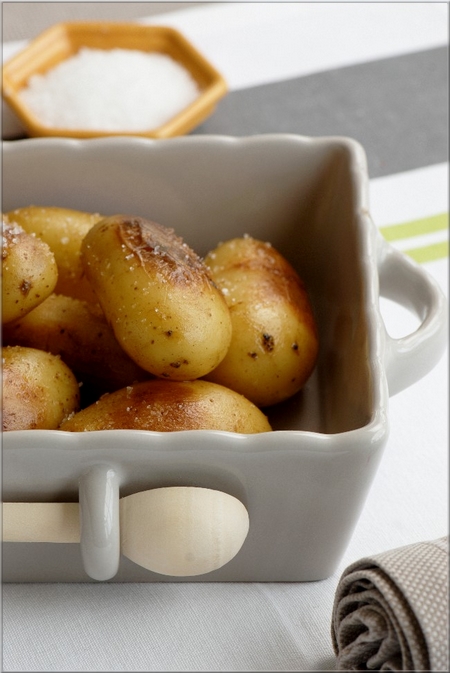 Dressage : mettre dans un plat de présentation les pommes de terre. Parsemer de fleur de sel et pour les gourmands, une noisette de beurre.