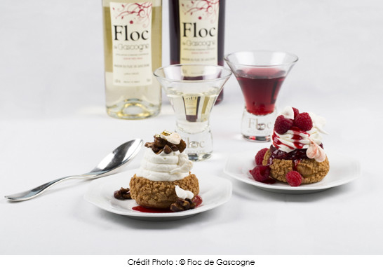 Une profiterole au Floc de Gascogne Rouge pour “elle”, et au Floc de Gascogne Blanc pour “lui”,