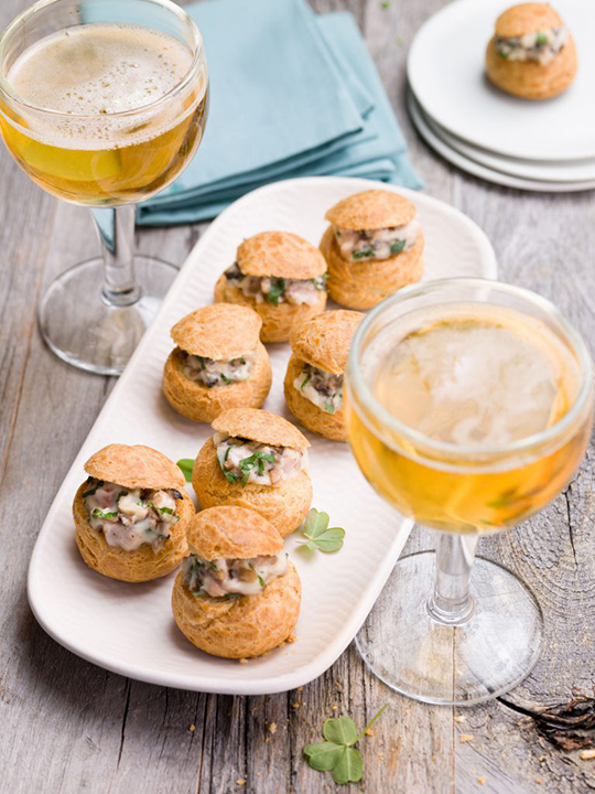 Profiteroles au jambon et champignons déglacés au cidre brut