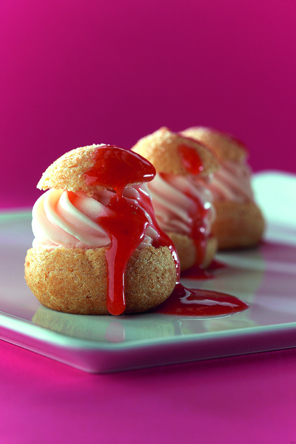 De tendres petits choux, garnis de crème glacée au Biscuit Rose et recouverts d’un coulis de framboise.