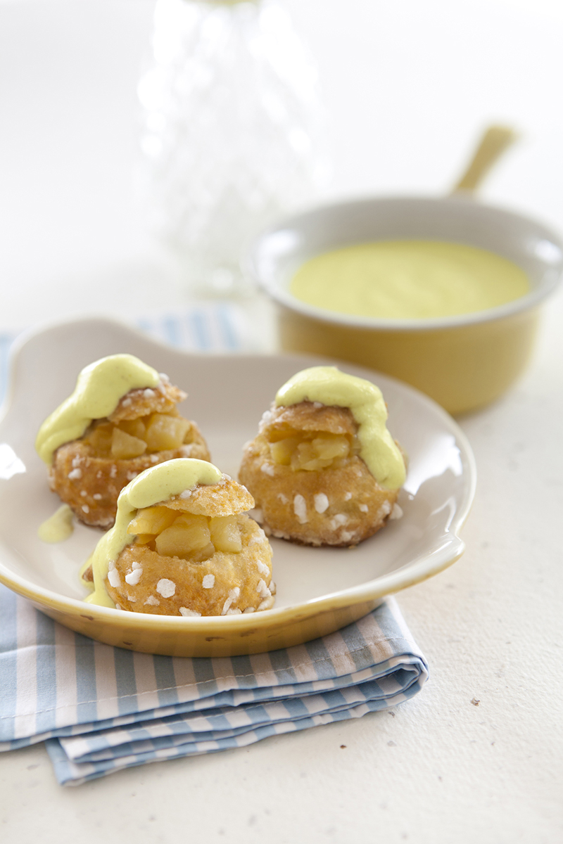 ④• Étêter les chouquettes (à 1/3 de leur hauteur) et les farcir de compote de pomme.