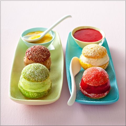 – Préparer de jolies boules de glaces de 3cm de diamètre en variant parfums et couleurs. Réserver les boules quelques minutes au froid et disposer dans les choux puis poser le couvercle et saupoudrer très légèrement de sucre glace. Disposer sur les assiettes, accompagner de coulis de cassis très chaud à verser au dernier moment.