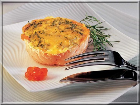7.Beurrer l'intérieur de petits moules à muffins. Chemiser les bords de tranches de saumon égouttés, y placer une couche de pommes de terre, une couche d'oignon, le saumon et l'aneth hachée.