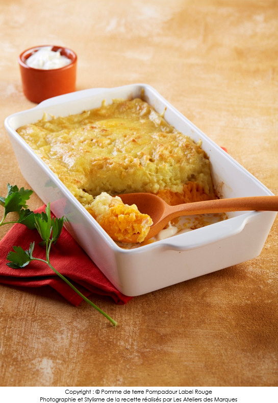 ⑤• Dans un plat à gratin beurré, étalez en couches successives les Pompadour écrasées, la purée de potiron, et pour finir le comté râpé.