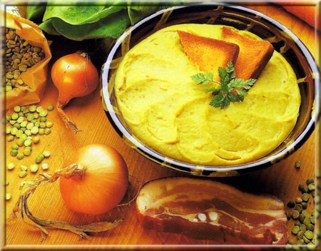 1.Mettre les pois cassés dans une grande casserole avec la laitue, l'oignon émincé, la carotte en rondelles, la poitrine fumée coupée en petits dés, l'ail écrasé, le bouquet garni, du sel et du poivre.