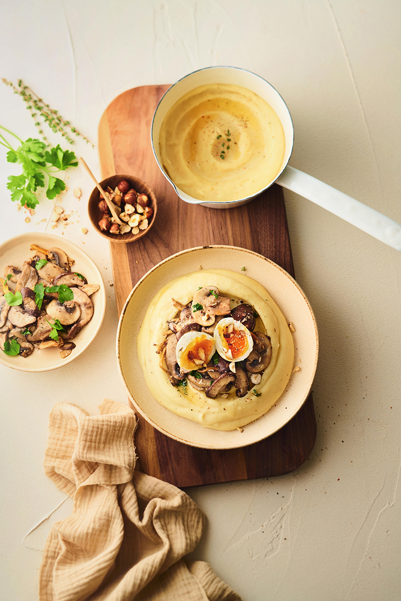 Purée Mousline® crémeuse, poêlée de champignons, œuf mollet et noisettes