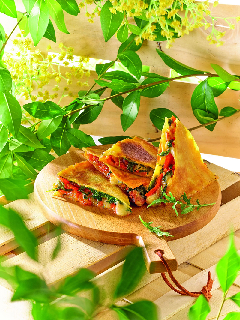 ④• Déposer des lanières de poivrons rouges et des feuilles de roquette. Disposer les tranches de chorizo et déposer les lamelles de Beaufort. Couvrir avec une deuxième tortilla.