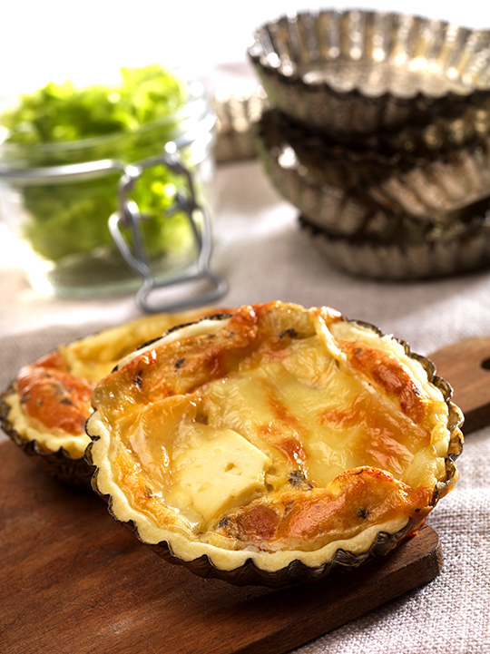 ④• Déposez votre mélange oignon/lardons dans le fonds de tarte puis les tranches de Chaource.