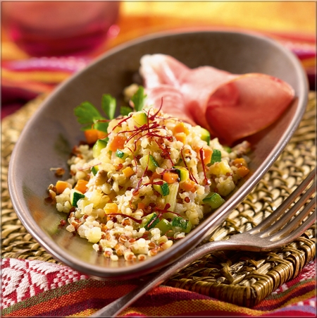 Pour finir, salez, poivrez le Quinotto et ajoutez sur le dessus le jambon de Parme et le persil.