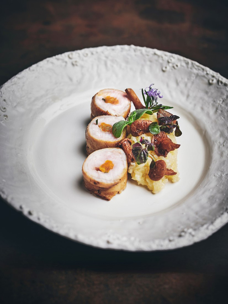 Râble de lapin farci aux abricots confits, romarin, célerisotto aux girolles