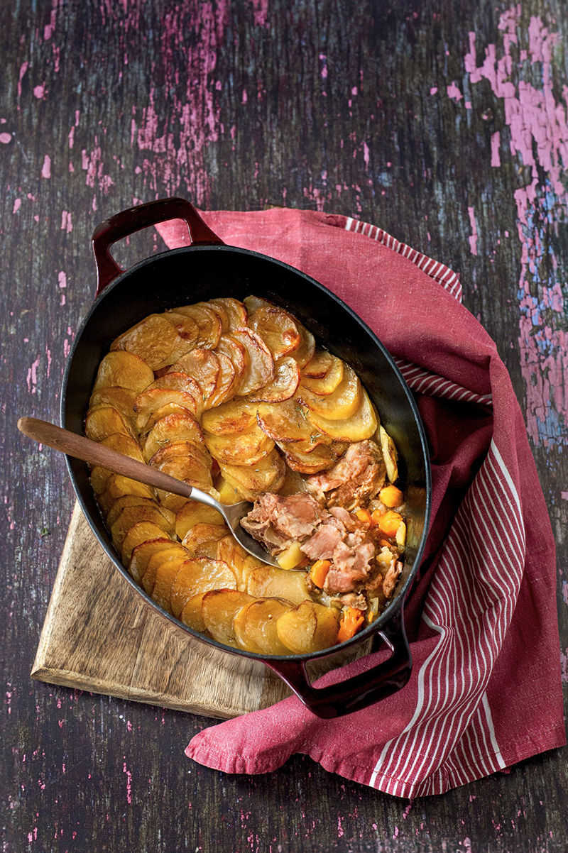 Bien aplanir la viande au moment de placer les pommes de terre pour obtenir une belle rosace. Appelé Lancashire Hotpot en Angleterre, cette recette traditionnelle peut se réaliser à partir d’un reste de rôti d’agneau ou d’un haricot de mouton.