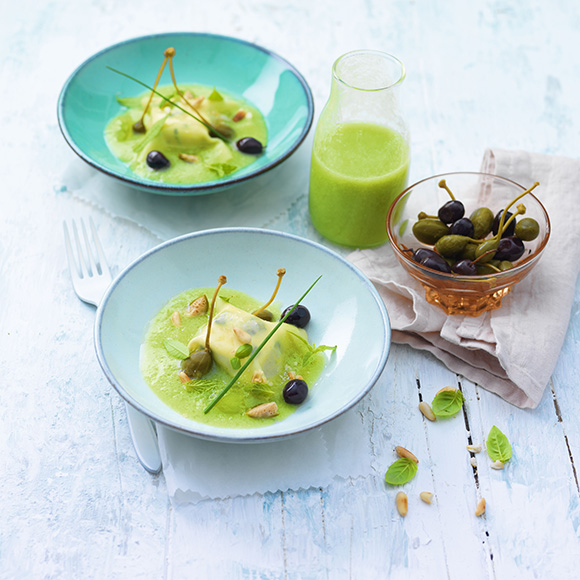 Raviole de Carré Frais® aux herbes, bouillon de tomate verte green zebra, olives violettes et câpres capucine