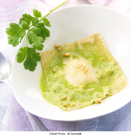 Raviole de Tartare® Oignon rouge & Coriandre, bouillon vert