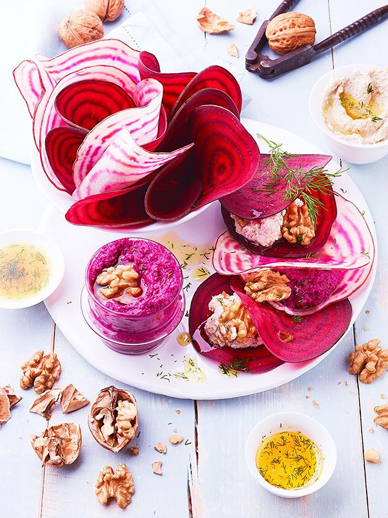 ⑤• Dans chaque assiette, disposer des rondelles de betterave crues. Ajouter en alternant le houmous de betterave aux noix et la crème de noix. Recouvrir de lamelles de betterave. Parsemer de cerneaux de noix du Périgord et arroser avec la vinaigrette. Servir avec le reste des lamelles de betterave, de houmous, de crème et de vinaigrette.