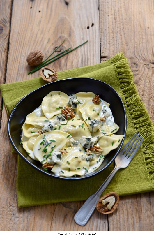 ⑤• Dans une sauteuse, faites chauffer la crème liquide, lorsqu’elle bout, ajoutez le roquefort, poivrez et versez la sauce sur les ravioles.