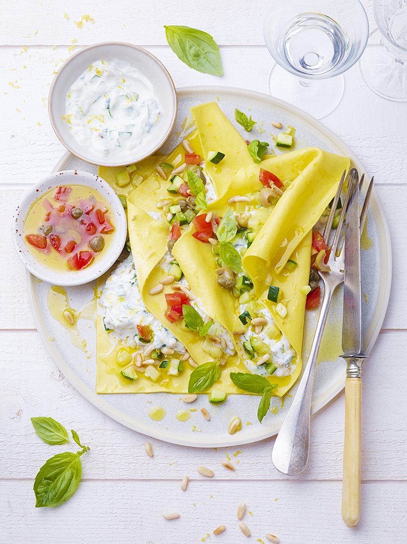 ⑤• Pour le dressage : comptez 3 demi-feuilles de lasagne par personne, alternez-les dans les assiettes avec les dés de courgettes et des cuillères de sauce au fromage blanc.