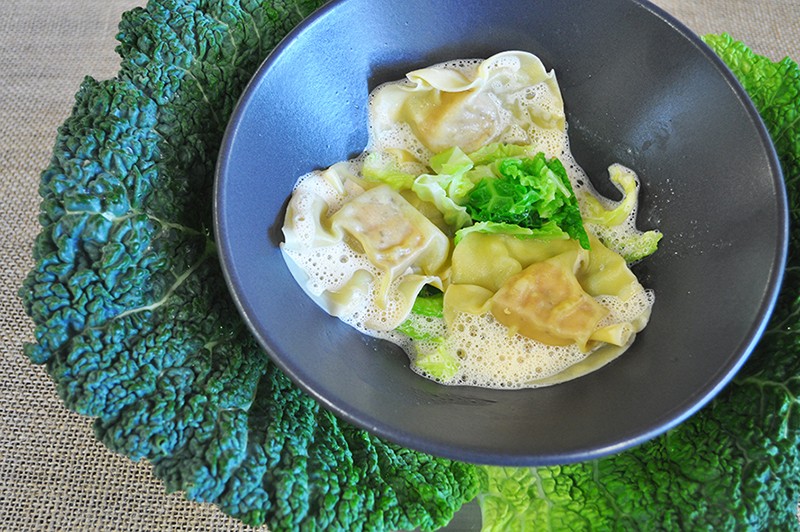 ⑧• Déposez les lanières de chou vert cuites au fond de l’assiette puis disposez les ravioles de foie gras cuit et nappez de sauce au foie gras.
