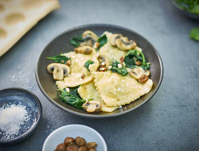 Ravioles maison, ricotta, épinard au Gros Sel Le Guérandais et noisettes torréfiées