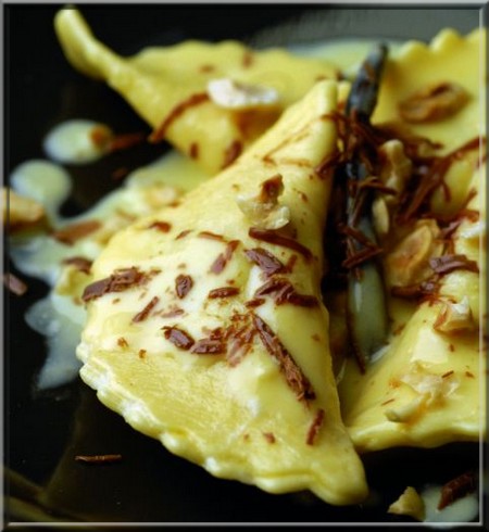 Déposer les ravioles dans une assiette creuse et napper de crème anglaise.