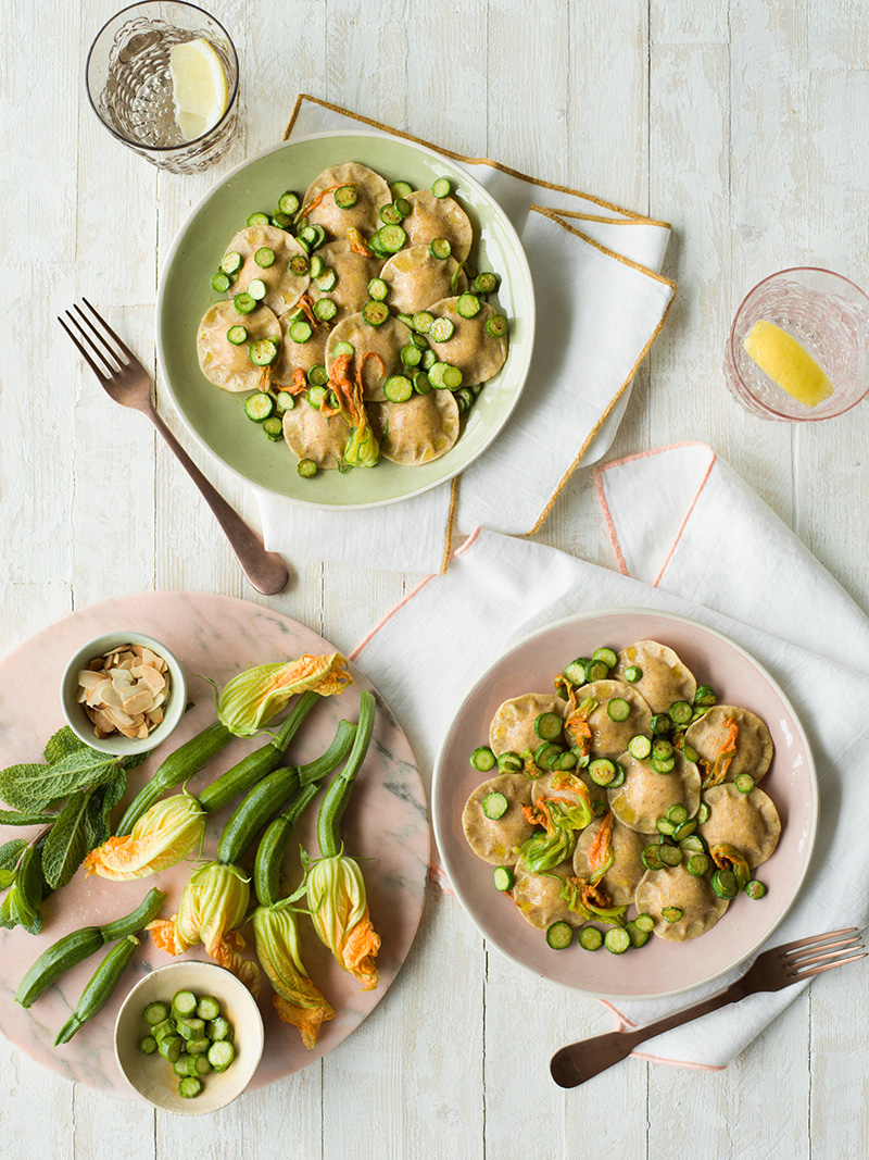 Ravioli Bio au Blé Complet Petits Pois Tendres et Fondants avec courgettes, amandes et menthe